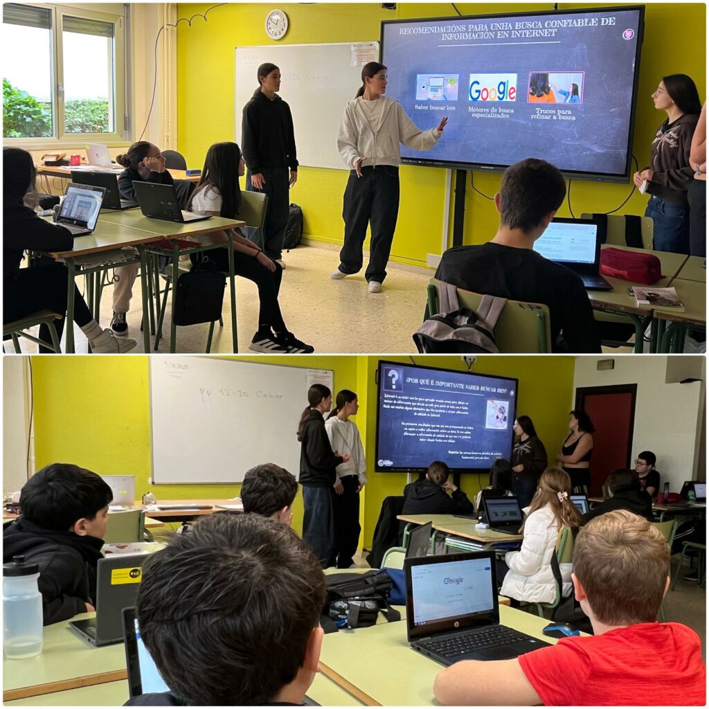 Para poder facer un bo traballo de investigación un dos primeiros pasos é saber como buscar información. Como o alumnado de 1º da ESO tiña bastantes dúbidas sobre como facelo, algúns dos biblioaxudantes exerceron de formadores en ALFIN nas súas aulas. Esperamos que a formación lles resultase proveitosa e que se animen a poñer en práctica o aprendido nos traballos que lles encarguen o profesorado.