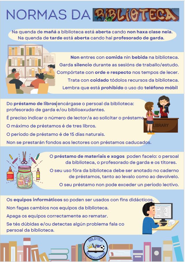 Nas NOFC (Normas de Organización e Funcionamento do Centro) aparecen recollidas as normas de acceso e uso da biblioteca escolar. Aquí vos deixamos un panel que resume as que consideramos fundamentais para o bo funcionamento da nosa biblioteca.