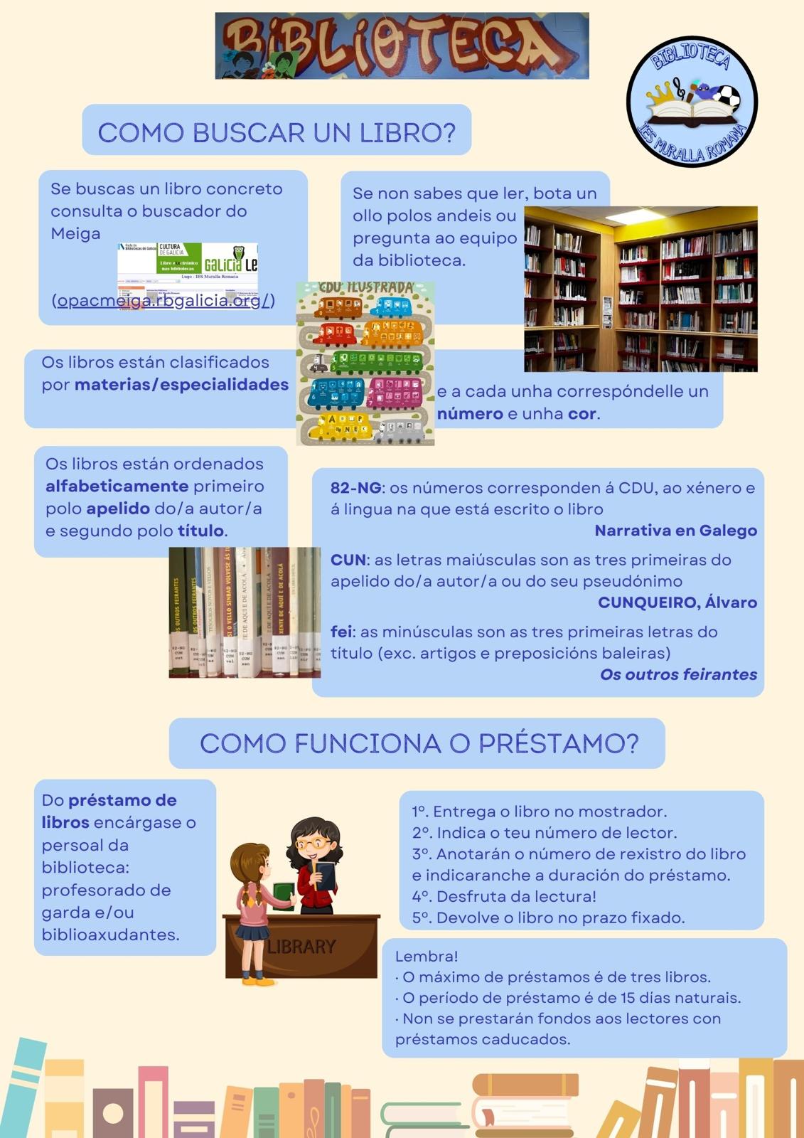 Por se non lembras ben como buscar un libro na biblioteca, aquí che deixamos unha breve guía que pode serche moi útil. Así e todo, o equipo de biblioteca e os biblioaxudantes estarán ben dispostos a botarche unha man sempre que o precises.